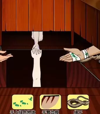 3、第三个手,手上绿色物体、手臂血痕、绳子。