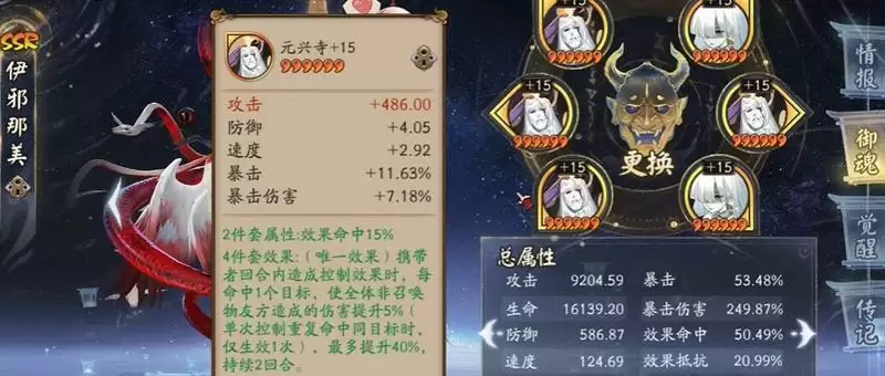 元兴寺的搭配能够让我们在增加伤害的同时辅助队友的输出,对于本身就附带辅助技能的伊邪那美来说效果更强,26位携带爆伤,是竞速的人权搭配。