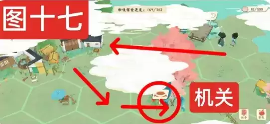 2、然后往村子这边走,在往粉色树子那边走,就可以看到一个机关。