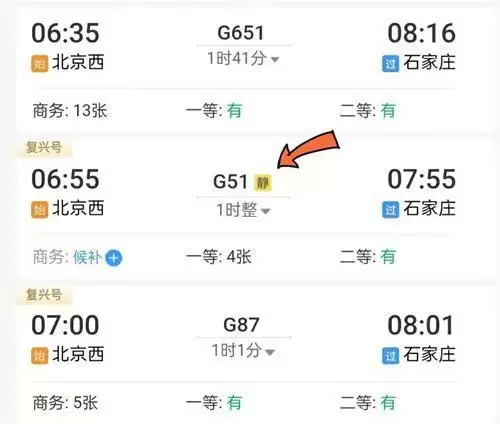 2、注意看,车次的后面有一个【静】字的列车就是有静音车厢的列车。点击进入之后,可以看到左上角的【静】这个就是静音车厢的车票。