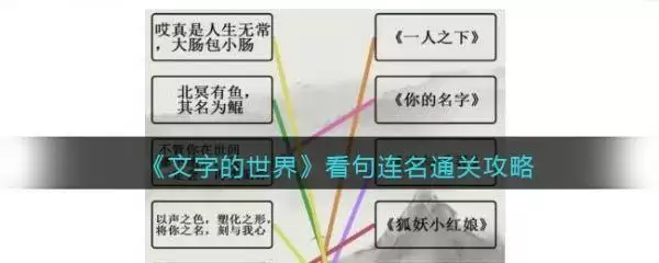 文字的世界是抖音中十分的热门的文字益智小游戏,游戏中看句连名怎么过?这一关需要看台词句子,连线正确的剧名,都是动画片里的台词,接下来小编就将为大家带来了抖音小游戏《文字的世界》看句连名通关攻略,感兴趣的来看看详细攻略吧。