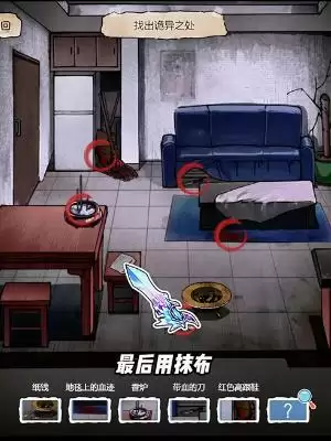 3、进入屋子后可以找到:纸钱、香炉、红色高跟鞋、地毯上的血迹,上滑沙发找到带血的刀,移动抹布擦拭壁画,找到照片。
