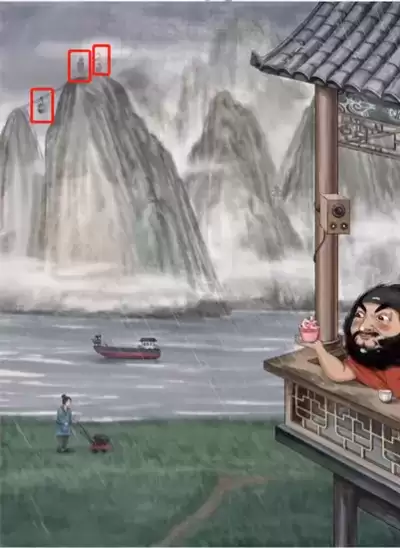 2、然后找到对面的信号塔、大河里面的伦船、前面草坪的除草机。
