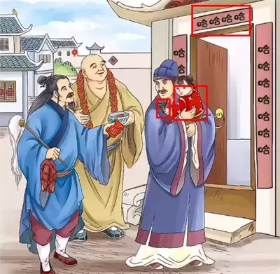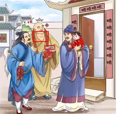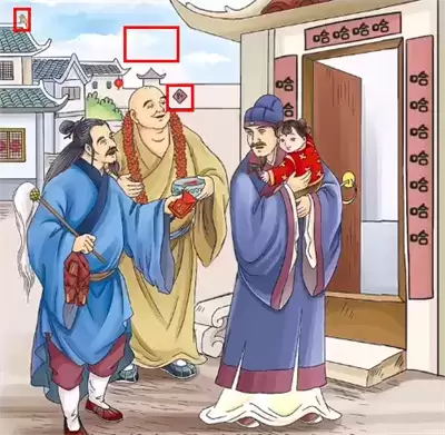 3、左边窗户上面的窗花、光头后面的墙上的红灯笼、左边道士手上的腊肉。