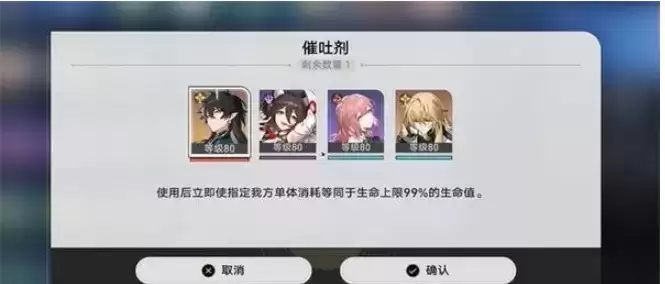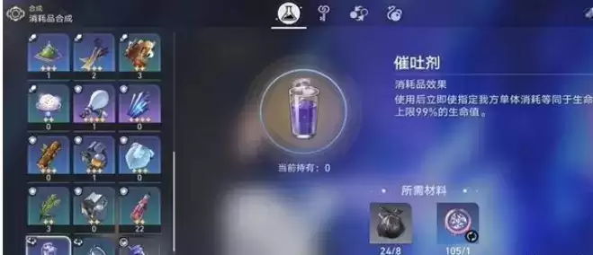 1、首先我们需要先合成一个催吐剂,给队伍当中的任何角色使用即可。