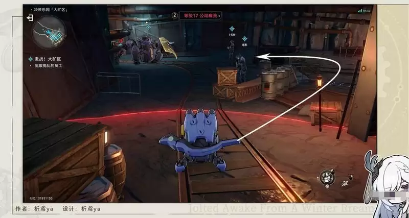 5、跟随指引来到下一处,同样是等雇员往回走时,我们绕到矿车后面引爆即可
