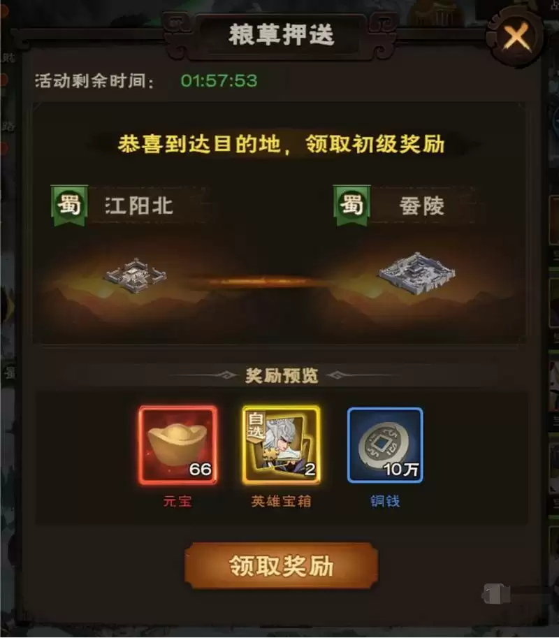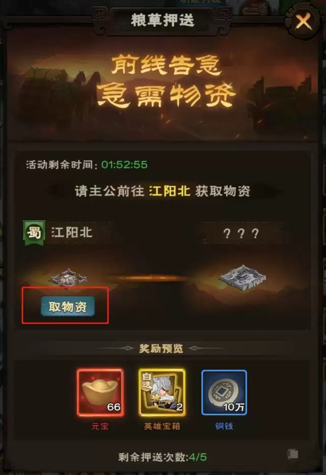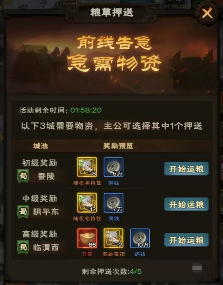 英雄到达目的地城池可以交还物资,获得对应奖励,每次活动可参与5次;
