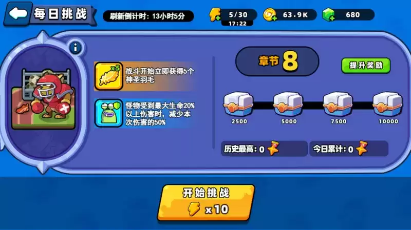 4、每日挑战关卡难度随主线关卡章节进度提升,难度越高奖励越好