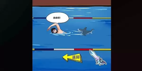 5、这个时候我们点击男人拖到泳池里,然后点击鲨鱼也拖到泳池里。