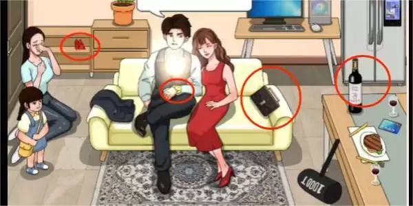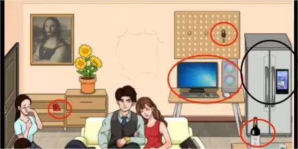 1、可以看到左边的高跟鞋、右边后面墙上的车钥匙、冰箱、拉菲红酒,点击地上的锤子锤爆电脑。