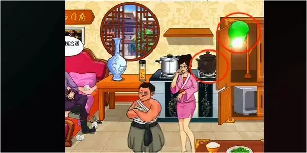 3、上面柜子的绿帽子,再点击旁边的药罐子。点击锅里面的生蚝和旁边的枸杞。
