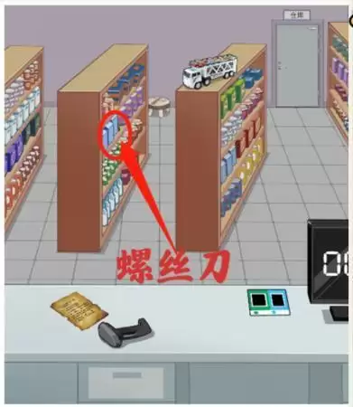 点击电话,拖动货架上的商品,找到螺丝刀,拖动螺丝刀到显示器上,再点击门