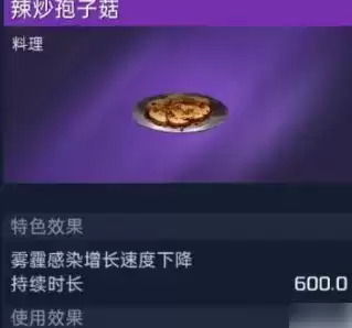 在家园烹饪中,如果能收集4个鲜艳孢子菇,放进去就可以得到最终辣炒孢子菇,将剧毒而美丽的孢子菇,经过烹饪之后就变成了可口料理。因为食材稀有,所以得到品质直接就是紫色。基础效果为提高56点饱食度和14点饮水度,基本上吃一个就能将饱食度恢复一半,但最关键依然是自己特色效果,使用者雾霾感染增长速度下降,持续600秒。
