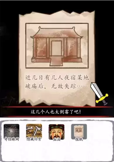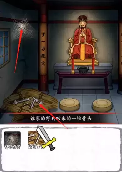 3、进入破庙点击蜘蛛网还有草下面的白骨。