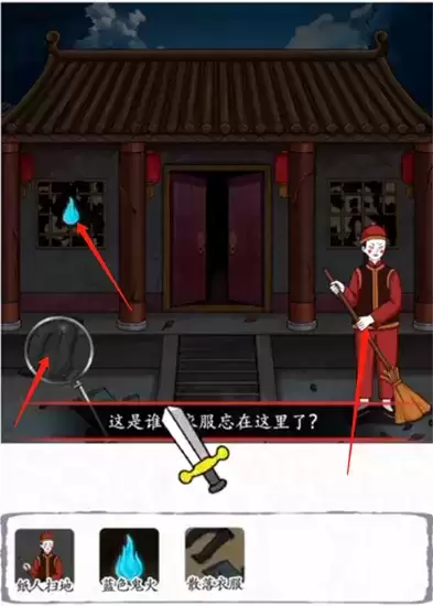 1、使用放大镜看右边会发现人,窗户有鬼火,台阶有衣服。