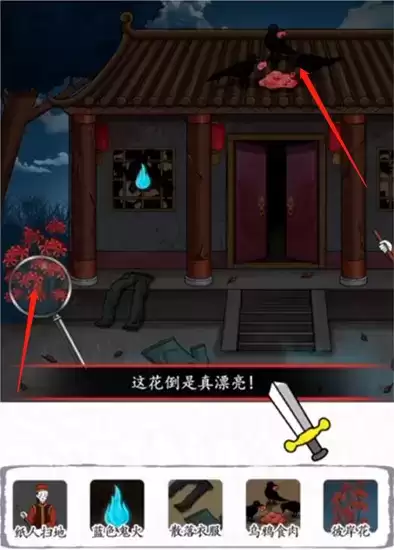 2、再用放大镜看屋顶上会有乌鸦吃肉,左边有彼岸花。