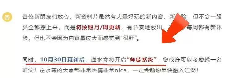 1、最新回答中10月30日更新后,逆水寒就将开启师徒系统了,届时大家就可以找一名师傅了。