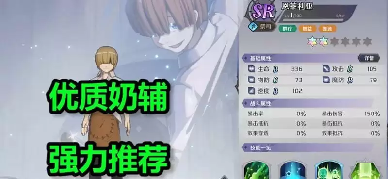 这个角色是一个强大的奶妈,能够保证玩家的生存,让队伍变得更加全面,并且sr的获取难度,是新手预抽卡必选的角色。