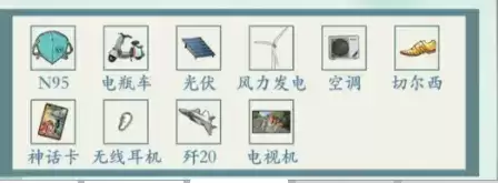答案:N95、电瓶车、光伏、风力发电、空调、切尔西、神话卡、无线耳机、歼20、电视机