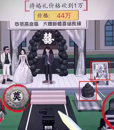 5、回到画面中间,点击强哥的西装,大嫂的裙子还有钻戒,还有黑白喜字。