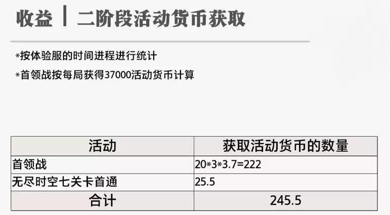 二阶段的互动货币由首领战为大头,共222,无尽时空7关首通为25.5,共245.5货币。