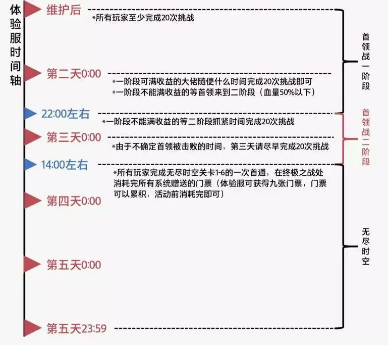 活动动时间共五天,包含了三个阶段,分别是首领战一阶段、首领战二阶段、无尽时空。