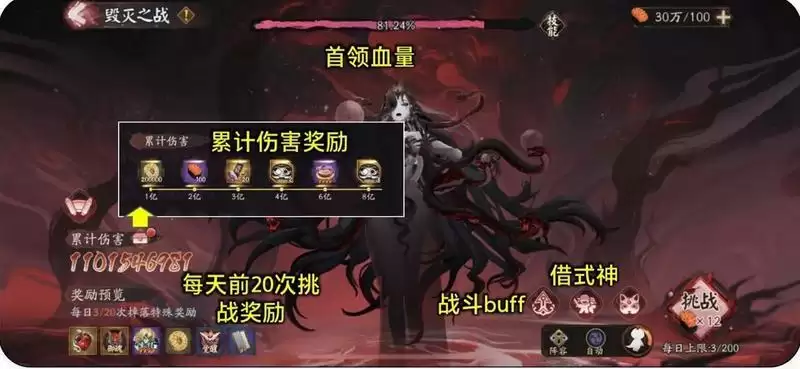 累积伤害最高档位的奖励为8亿,每日前20次挑战还能够获得额外的奖励。