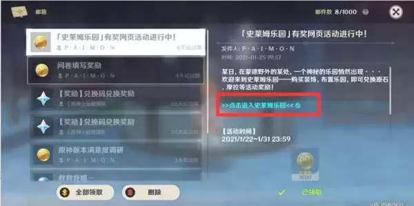 1、游戏中进入,点击左上角派蒙按钮,点击邮件,即可在邮件的链接中直接进入;
