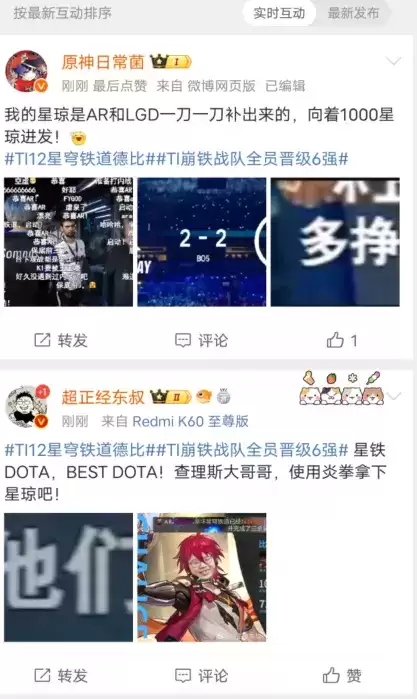 再到玩家涌入星穹铁道的微博超话打卡,分享AR和LGD晋级的喜讯。看着超话内不断滚动、有关TI12的消息,相信不少玩家与我一样,陷入了“是不是走错了超话”的疑问当中。
