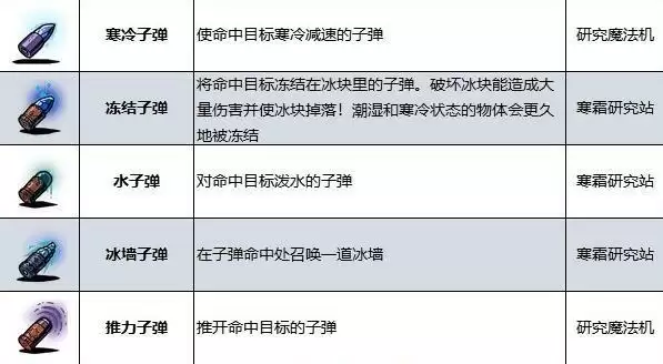 效果:将命中目标冻结在冰块里的子弹。破坏冰块能造成大量伤害并使冰块掉落!潮湿和寒冷状态的物体会更久地被冻结