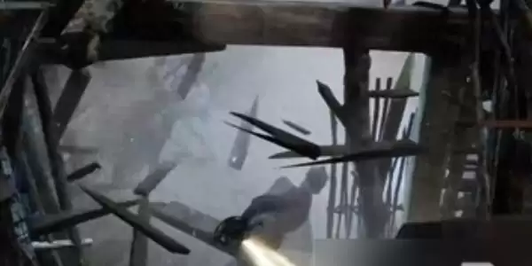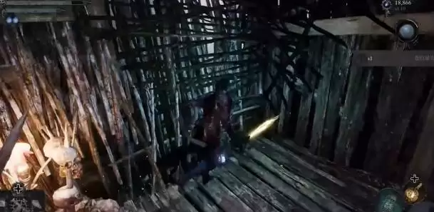 3、继续往前走会看到一堆木材堆积的地方,我们攻击木门,进入房间内。