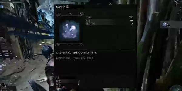 4、里面找到黄色光亮处,即可获取腐败之雾,这个法术可以召唤毒雾团,使进入其中的敌人中毒。该法术需要影界法器驱动,并且要求角色自身炼狱属性与光辉属性达到8点。