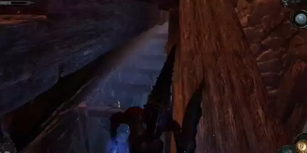 1、首先我们往右边过木桥,然后右转走到里面,向下爬梯子。