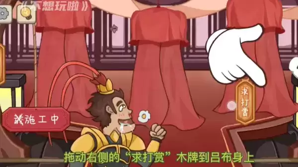 1、进入到游戏之后,会在右侧看到“求打赏”三个字,玩家需要拖动“求打赏”的板子移到吕布的身上,