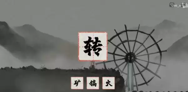 4、继续往前面走就可以看到一条河,车字和专字组合成转字拖动到旁边的水车。