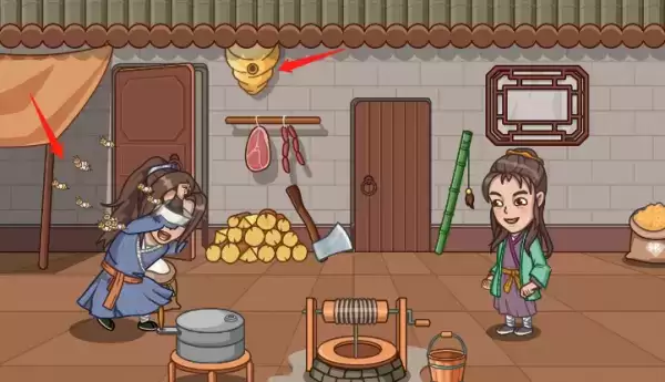 3、最后只要点击中间屋檐下的【马蜂窝】就会出现一堆【马蜂】,马蜂会跑去蛰盗圣,这样盗圣就被我们打赢了。