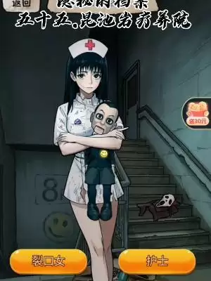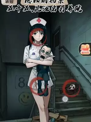 3、点击楼梯上的骷髅头、护工裙子上的油漆、向右走手势,下滑口罩发现怪异的嘴巴,右滑下面的破布出现电池,将电池移动给护工怀里的娃娃。