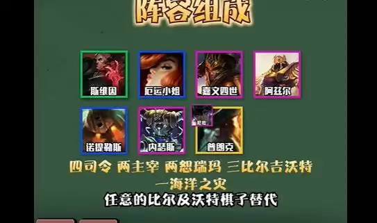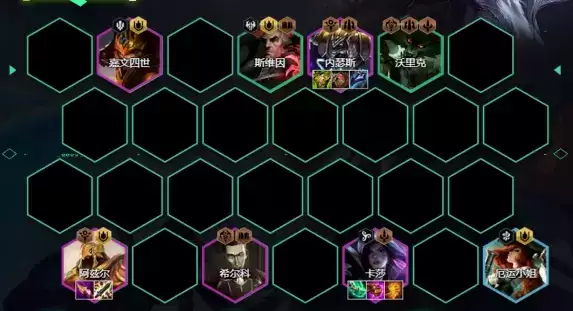 1、阵容组成:斯维因、沃里克、女枪、卡莎、嘉文四世、内瑟斯、阿兹尔、希尔科。