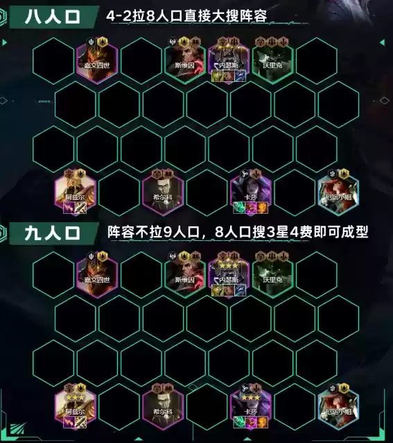 3、4-1阶段直接拉8人口,大搜2星阵容体系。优先找到2星内瑟斯+2星卡莎。后期观察是否有同行追内瑟斯、卡莎、沙皇这三张牌,如果没有同行直接在8人口追3星4费。