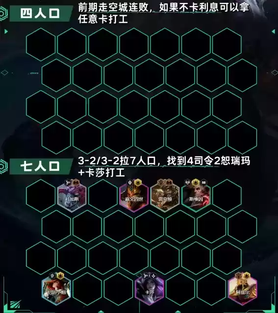 2、3-2阶段直接拉7人口,大搜阵容体系,优先找到4司令2恕瑞玛羁绊,如果没有内瑟斯,可以考虑用雷克顿代替,如果没有卡莎,可以考虑用尼菈打工过渡。