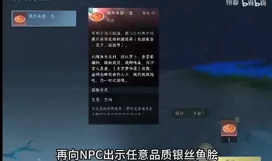 2、向NPC出示任意品质银丝鱼脍(可在烹饪获得或购买),都是可以的。