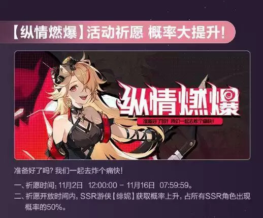 活动介绍:祈愿开放时间内,SSR游侠【绯妮】获取概率上升,占所有SSR角色出现概率的50%。