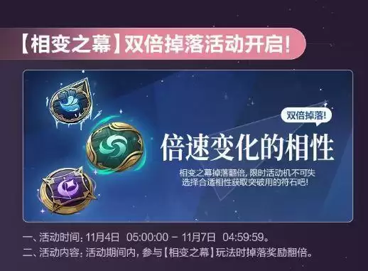 活动内容:活动期间内,参与【相变之幕】玩法时掉落奖励翻倍。