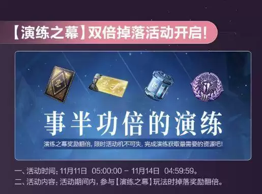 活动介绍:活动期间内,参与【演练之幕】玩法时掉落奖励翻倍。事半功倍的演练,演练之幕奖励翻倍,限时活动机不可失,完成演练获取最需要的资源吧!