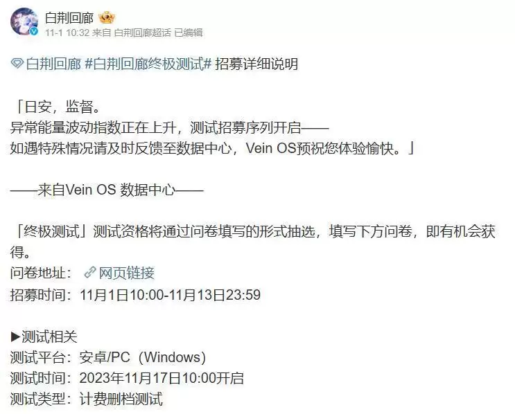白荆回廊什么时候公测?许多小伙伴都不是很清楚,这款游戏的最终公测的时间是2023年的11月17日上午10点,接下来就一起来看一看具体的公测时间介绍吧,让大家能够了解这款游戏的公测时间具体是什么时候。