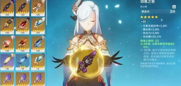 2、天空之脊+2角斗士+2追忆套,毕业属性为:3600攻击力、210%元素充能效果,双爆属性随意没有要求。