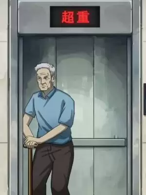 3、再次打开电梯门出现一个拄着拐杖的老头,电梯里只有他一个人,但是电梯显示超重,老头询问我们下不下,选择不下。再次按下行键关闭电梯门。