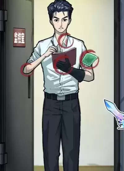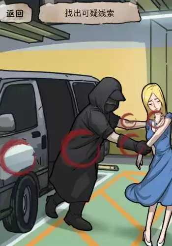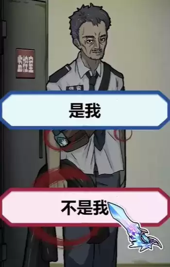 4、接下来会有一个保安进来,需要找到黑色雨衣、宝石项链、喷窝瓶,胳膊的抓痕,这里可以随便选择。