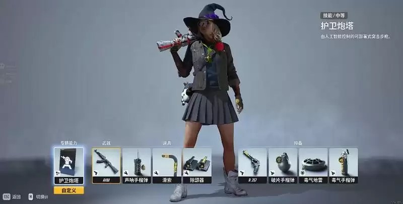 中1配装:专精炮塔、武器AKM、声呐手榴弹,道具滑索除颤器,也可以带左轮。
