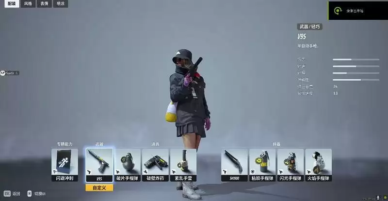 轻巧配装:专精闪避冲刺,武器V95、破片手榴弹,道具破壁炸药和紊乱手雷,这是团队的核心,需要两名中型保护进行输出。